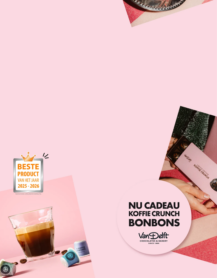 Soms kom je iemand tegen met dezelfde liefde voor smaak. Samen met Van Delft creëerden we de Koffie Crunch bonbon: melkchocolade, speculaas, koffie van onze Medium Roast koffiebonen en een crunchy bite van gepofte rijst. Ambacht, karakter en een flinke smaakexplosie in één.