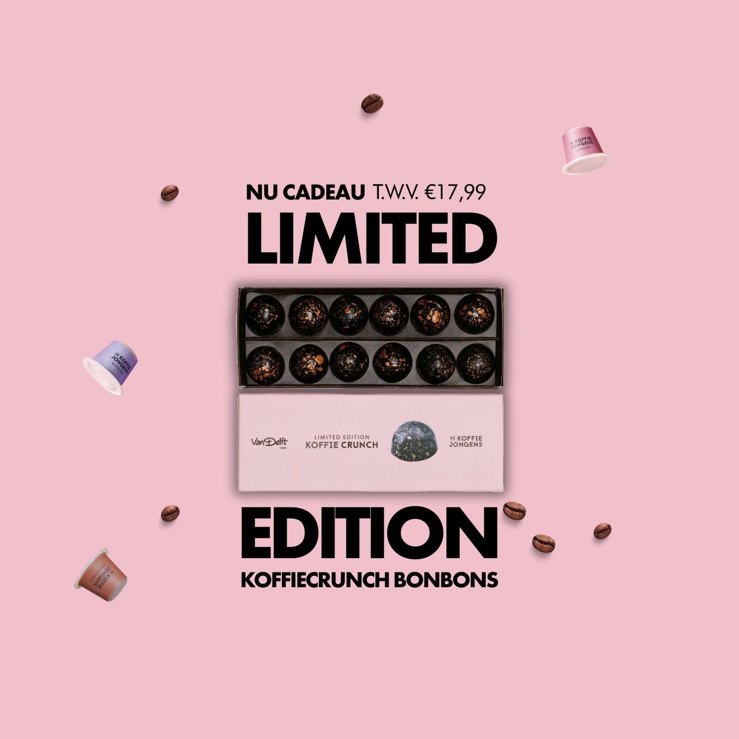 Samen met Van Delft creëerden we de Koffie Crunch bonbon: melkchocolade, speculaas, onze Medium Roast koffie en een crunchy bite. Vind jij een Golden Ticket in je doosje? Dan win je een half jaar gratis koffie.