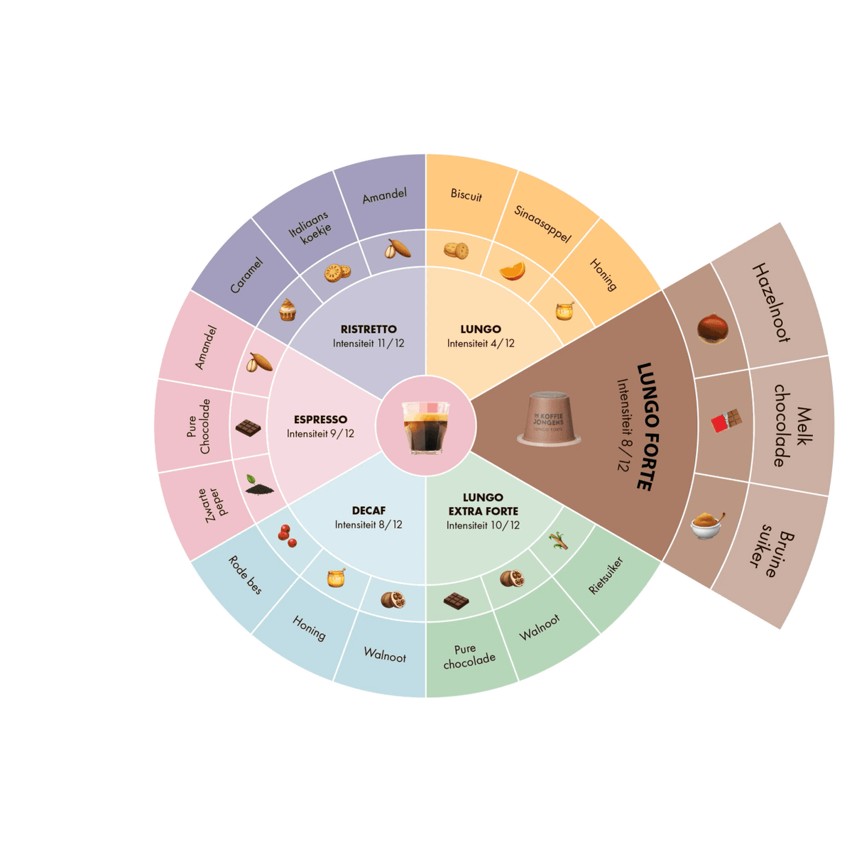 Voor wie houdt van een koffie met een beetje power én een soepele afdronk, is de Lungo Forte een favoriet. Het begint met een stevige cremalaag en een zoet, notig aroma met een vleugje cognac. Neem een slok en laat je verrassen door warme notensmaken, de zoetheid van bruine suiker en een lichte hint van karamel.